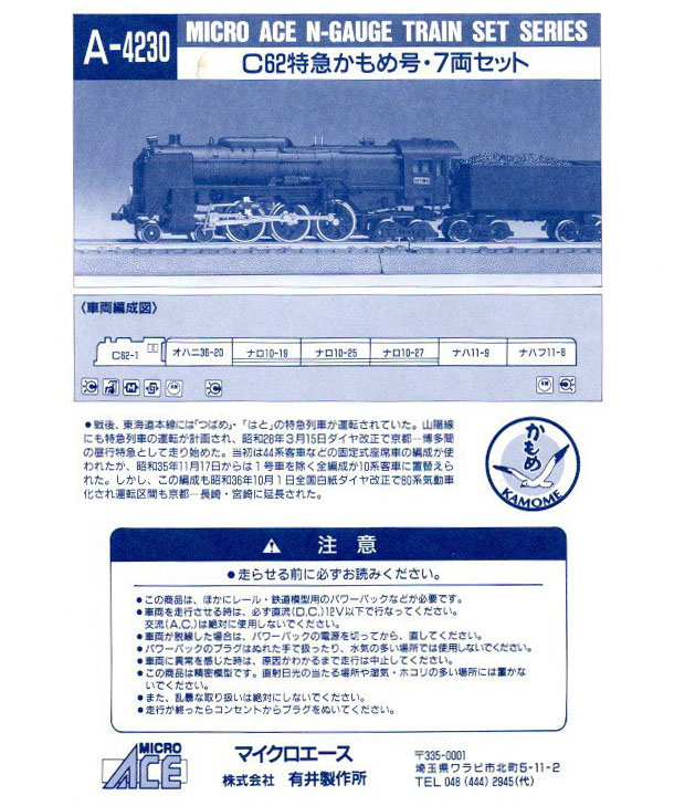 かなり以前に発売された、マイクロエースのかもめ。付属の説明書によると、こんなセットでした。目玉は、C62の1号機という事になりますか。結局C62を手放し、車両を処分し・・、とほぼ元の車両は残っておらず、この紙だけです。