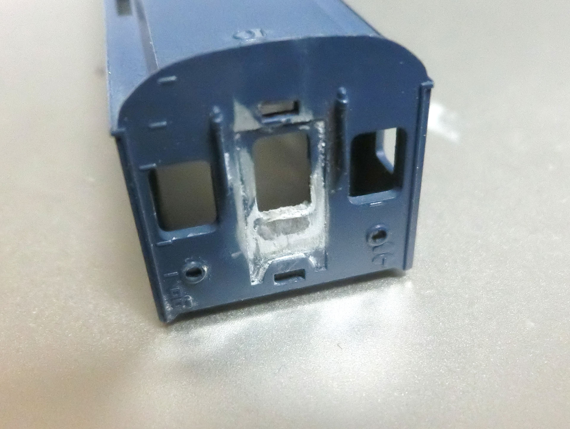 (別の車両の画像ですがやっていることは同じです)貫通扉にあけてある穴を埋めます。で、塗装すれば、もともとあった穴は気にならなくなります。
