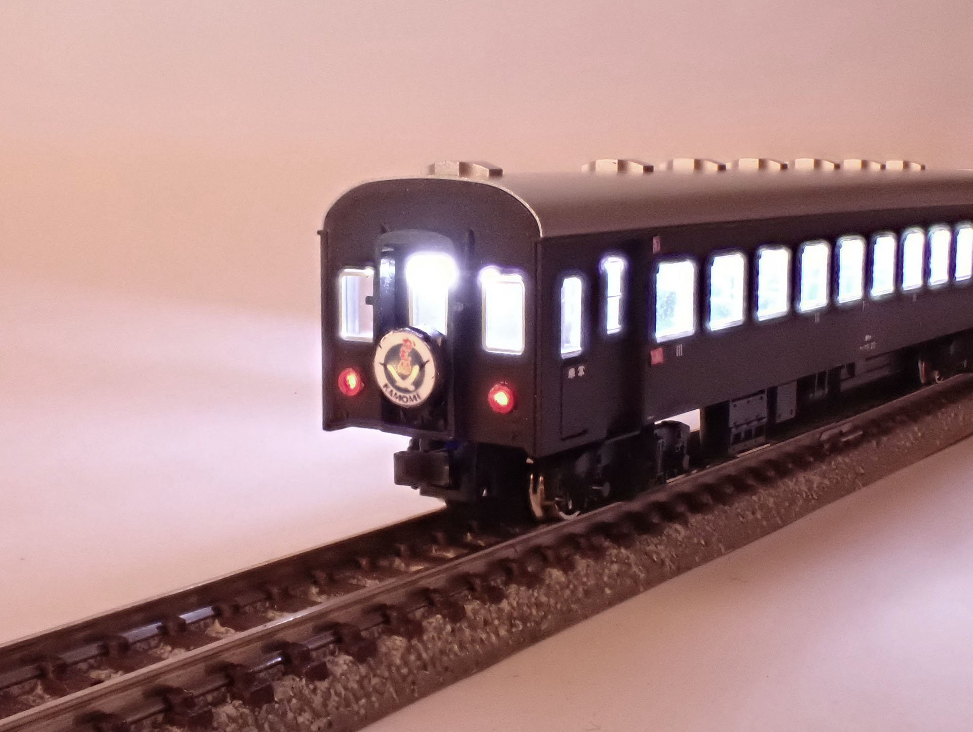 最後尾の車両には、行燈式サインがついていますが、私の持っているモデルは点灯しません。かわりに右画像のようなほろ枠をつけておりました。これはマイクロエースのセットの車両についていたほろ枠を拝借したものです。