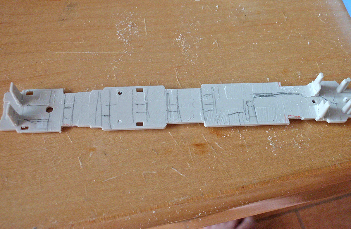 室内設備ももともとのオハ35の床板部分を残して、ゴリゴリと削っていきます。食堂車のテーブルとイスはどうするか、っていうのは、あとで考えることにして、とりあえず、床と仕切り板以外を削り落としておきました。そこらじゅう削りカスだらけになります。完全に削りきれていませんが、よしとします。このホームぺージは基本このスタンスです。
