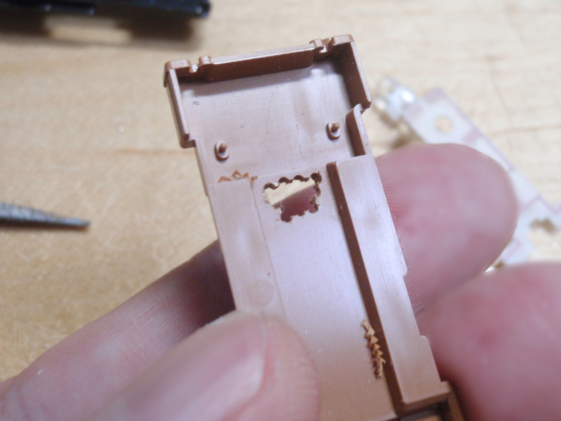 最後に、行灯式のテールサインを点灯させるため、LEDをもともとの基盤に追加しました。で、そのLEDを床板から飛び出させるための穴をゴリゴリとあけます。