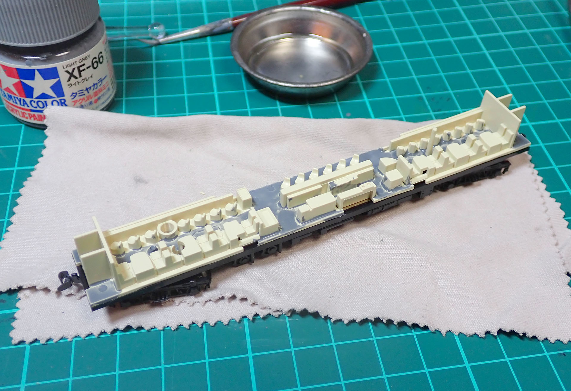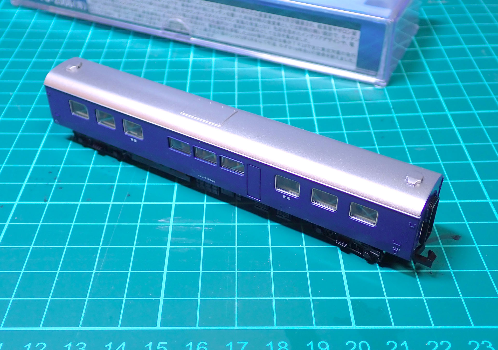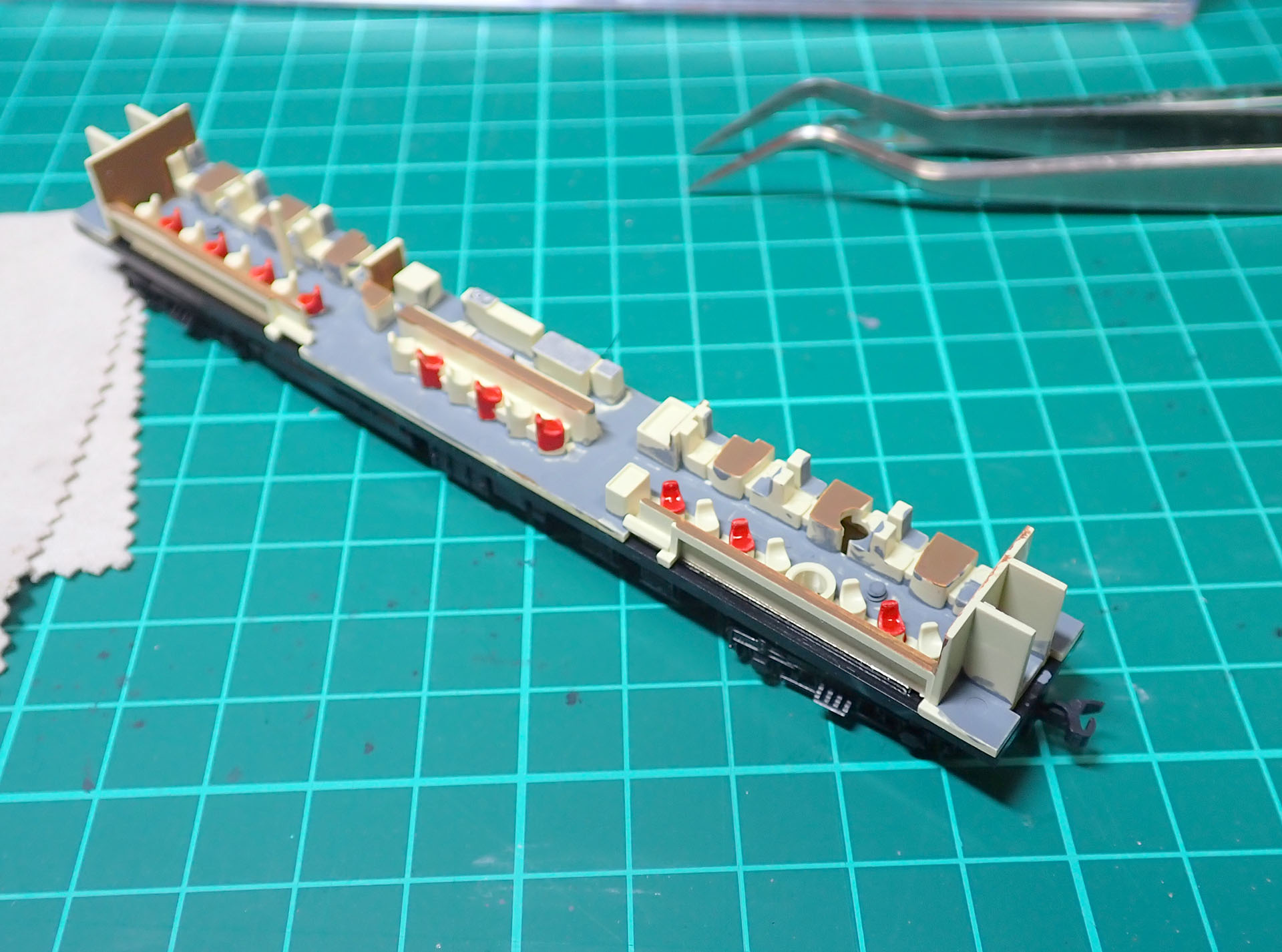わかりやすい例では、KATOのグリーン車の室内が、よく赤系で成形されており、室内灯を仕込むと窓から赤い光が漏れるのですけど、個人的にはこれが気になるので、雑でもいいから塗分けるようにしています。