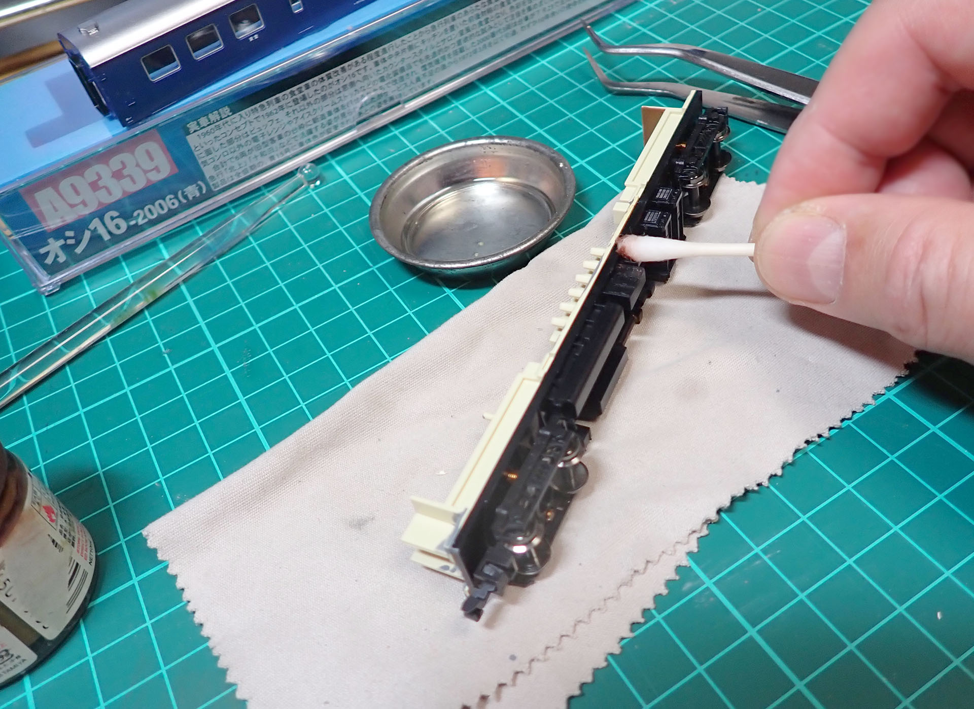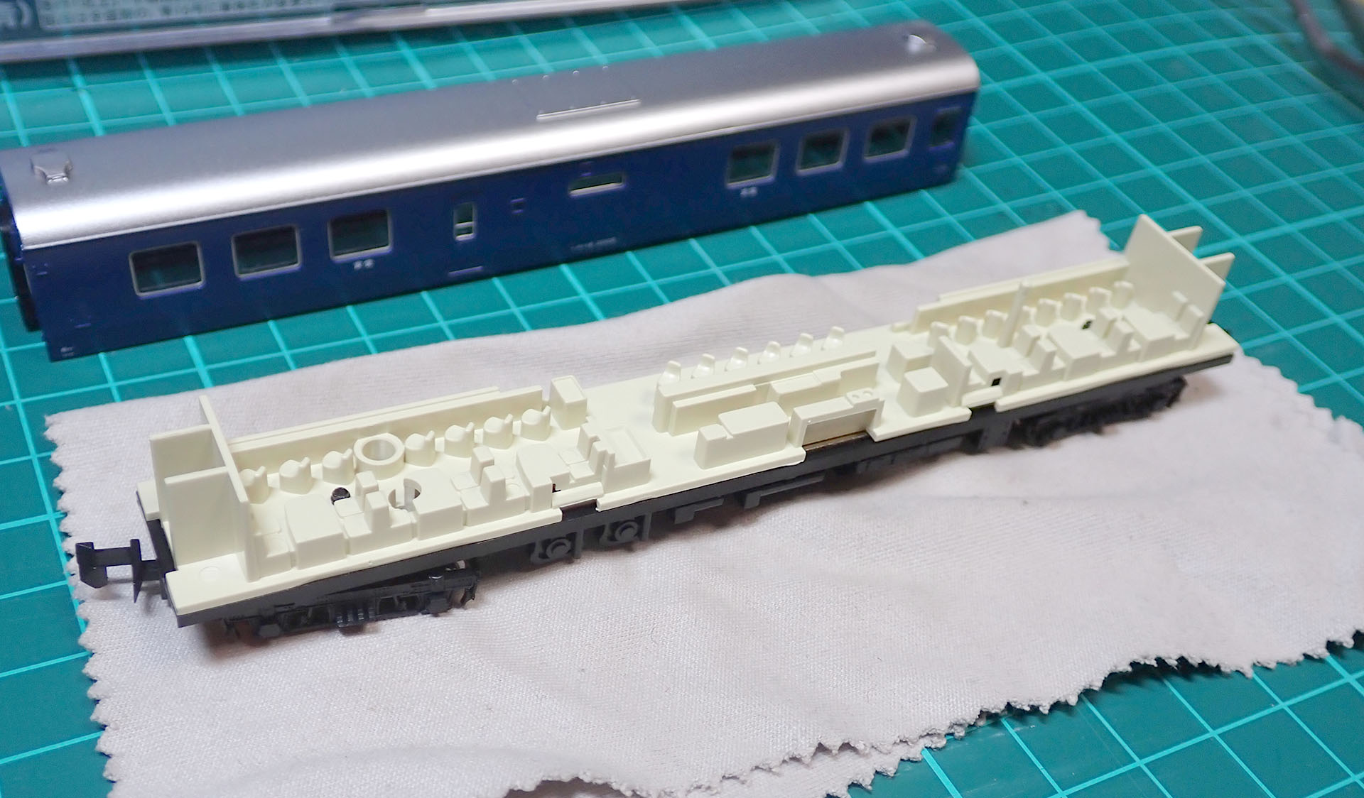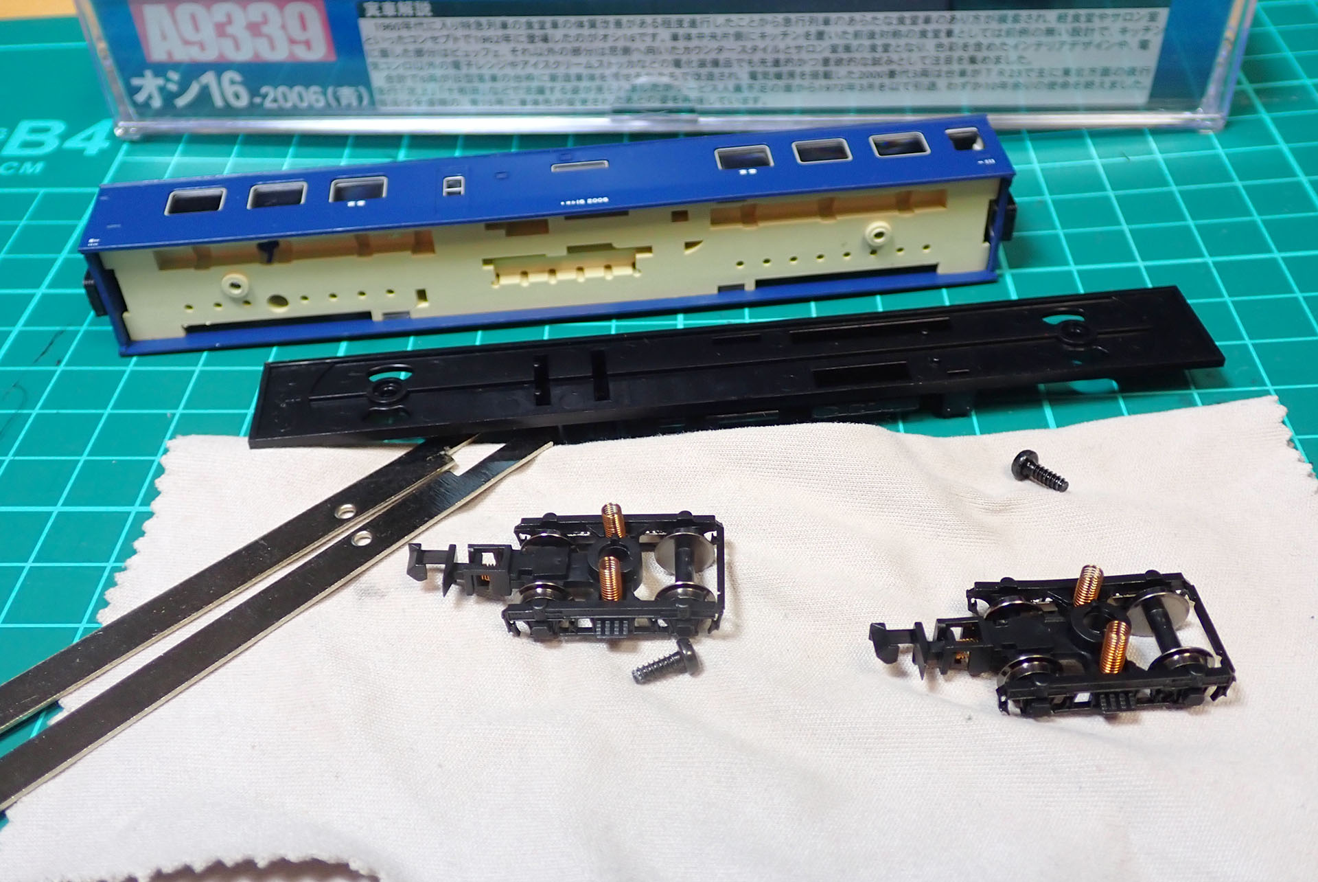 台車を外しなおしてKATOカプラーに交換し、他の車両と連結できるようにします。外したカプラー・ばねは、何かに使うかもしれないので、そのままとっておきます(たまる一方です)。