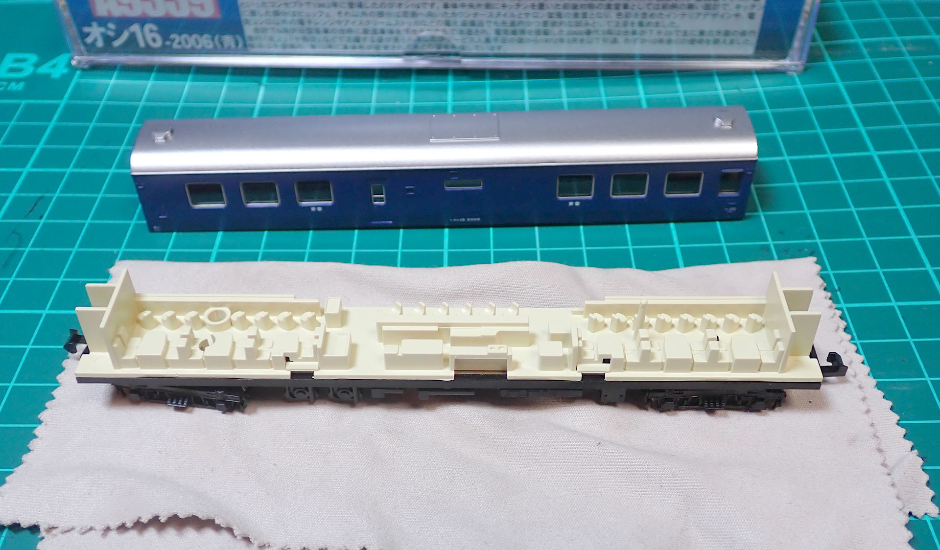この構造の室内灯は、バネと床下の集電部との接触が命で、微妙な塩梅で室内灯がつかなくなったりします。うまく点灯した状態でそのままボディをかぶせておきました。