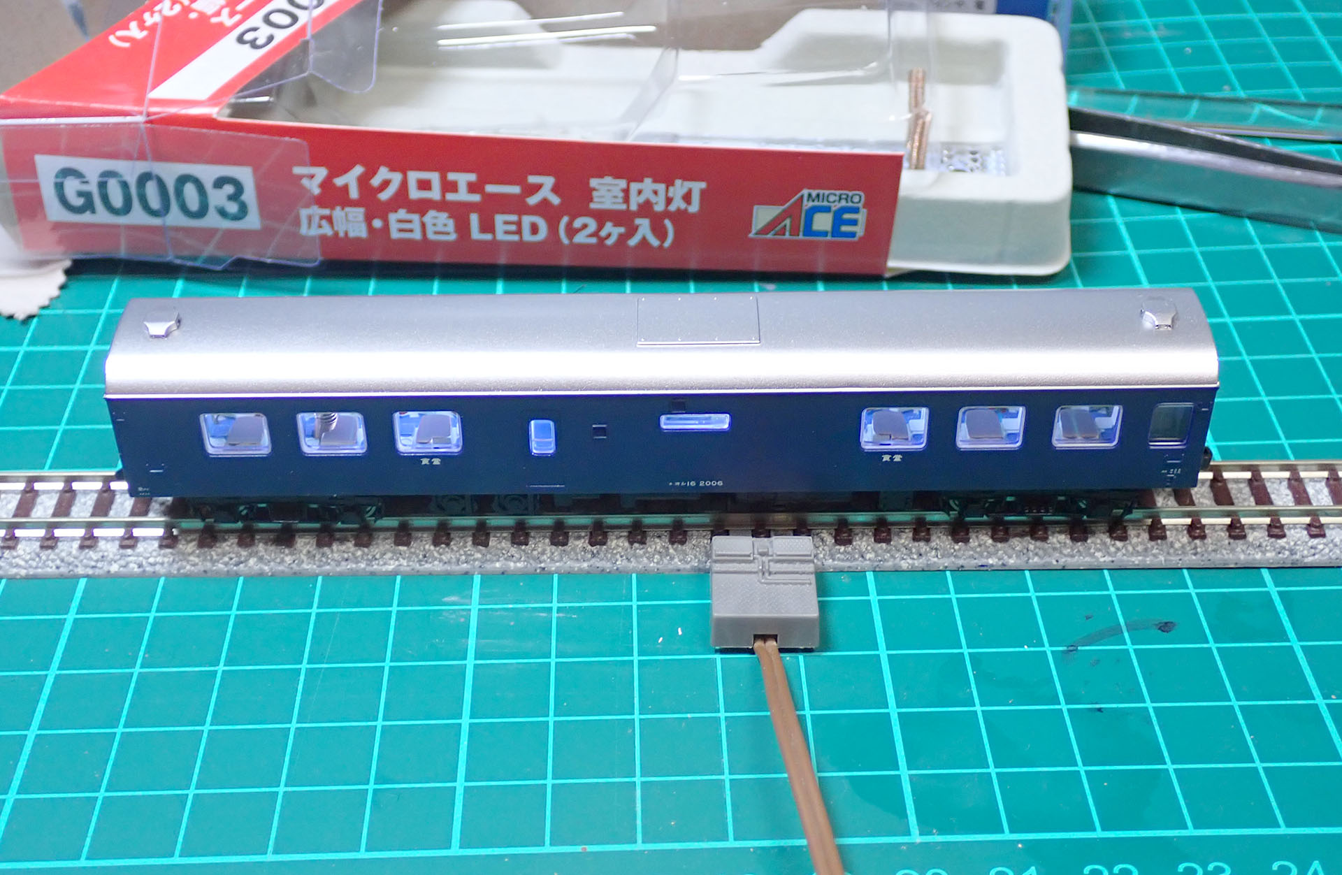 点灯させたところです。構造はTOMIXの室内灯と酷似していると感じます。もちろんきれいに発光し、とても良い感じです。
