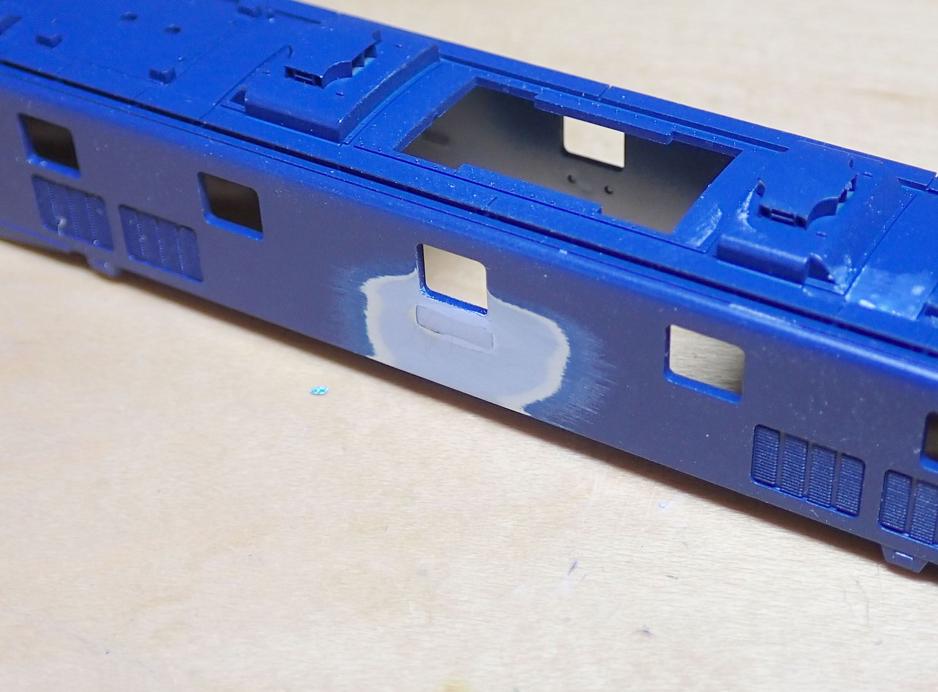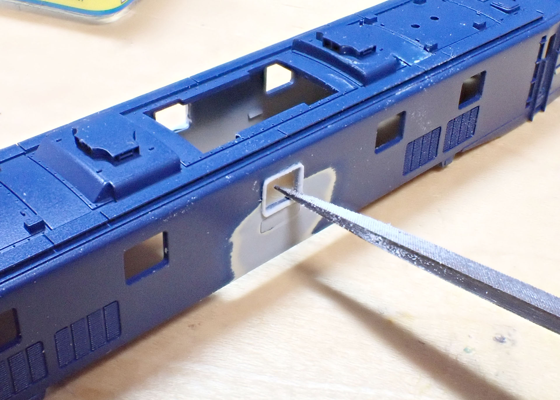 買ったときから157号機のナンバーがついていました。貼り付けのナンバーに変更しますので、隙間を埋め、ヤスリで平らにしておきます。