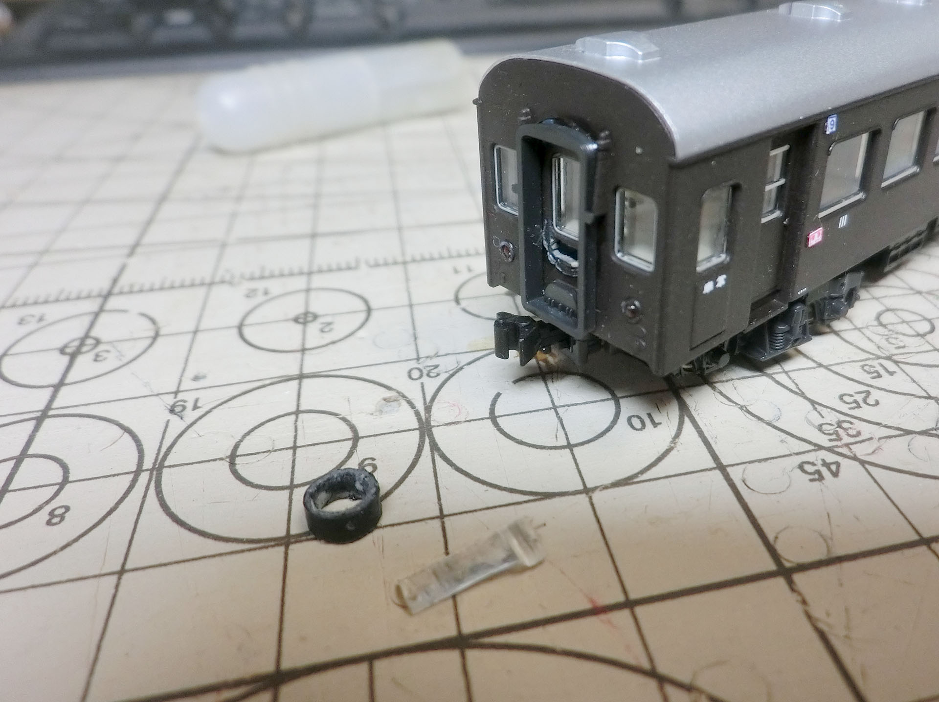 (別の車両の画像ですがやっていることは同じです)貫通扉にあけてある穴を埋めます。で、塗装すれば、もともとあった穴は気にならなくなります。