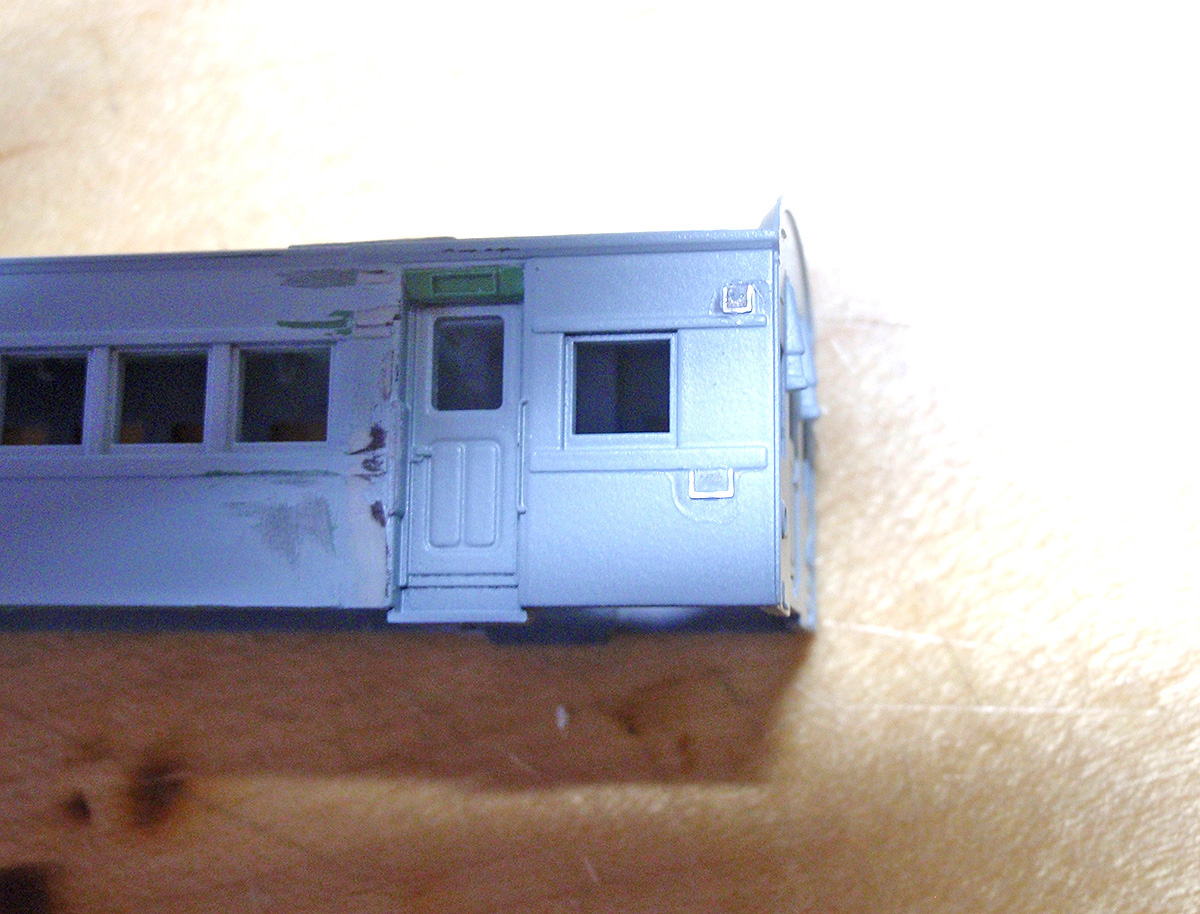 スハフ43は、スハフ42と違い、等級表示のための行燈がドアの上についています。いらなくなったスハ44のドア部分から、切り出して、移植しました。