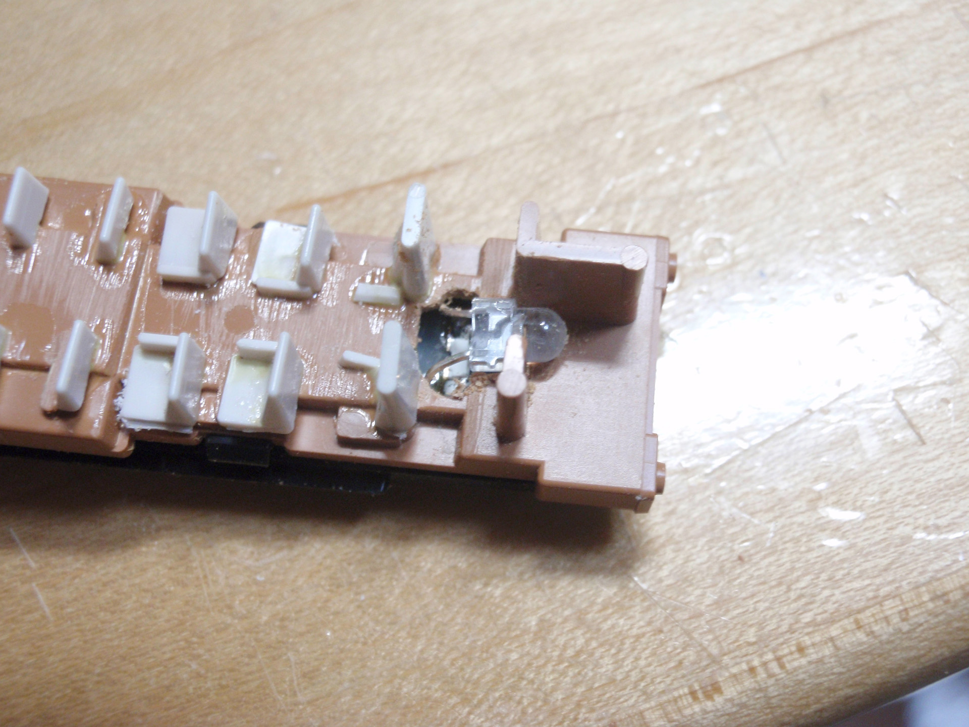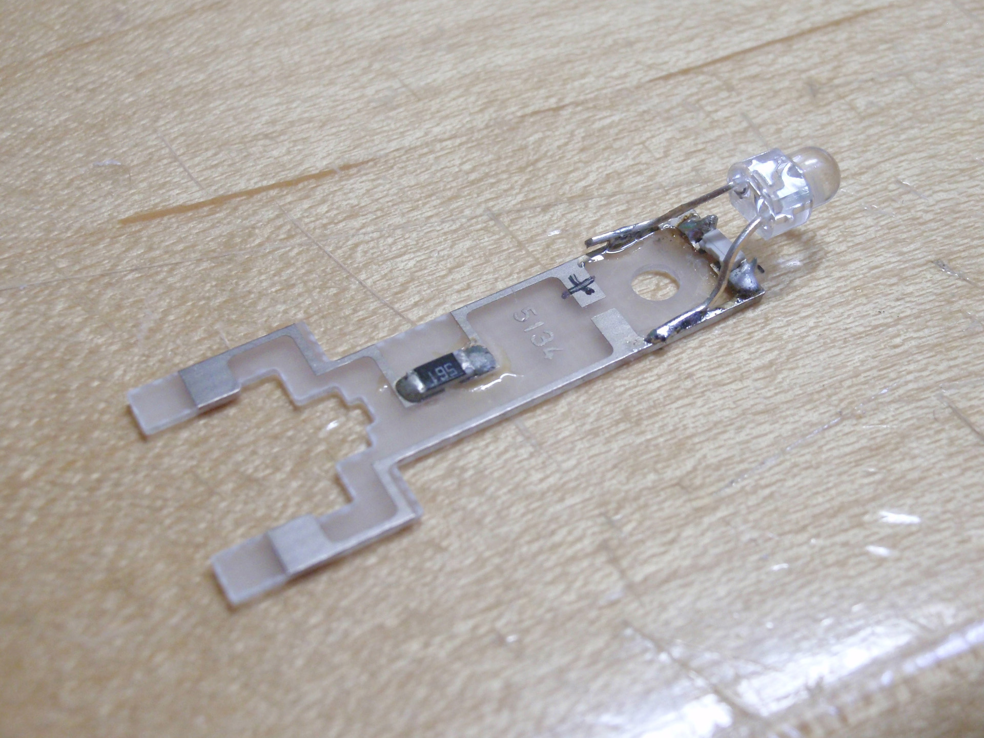 最後に、行灯式のテールサインを点灯させるため、LEDをもともとの基盤に追加しました。で、そのLEDを床板から飛び出させるための穴をゴリゴリとあけます。