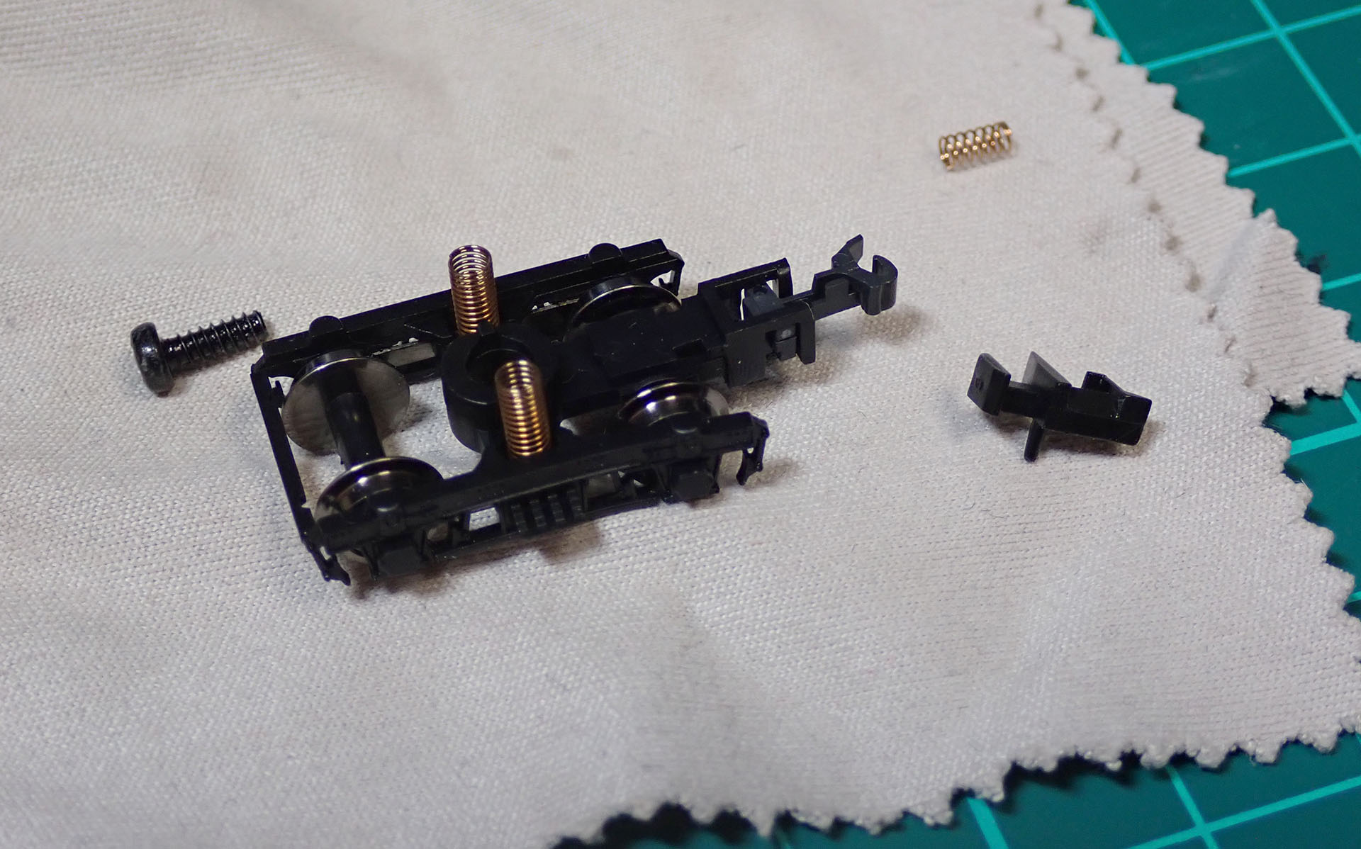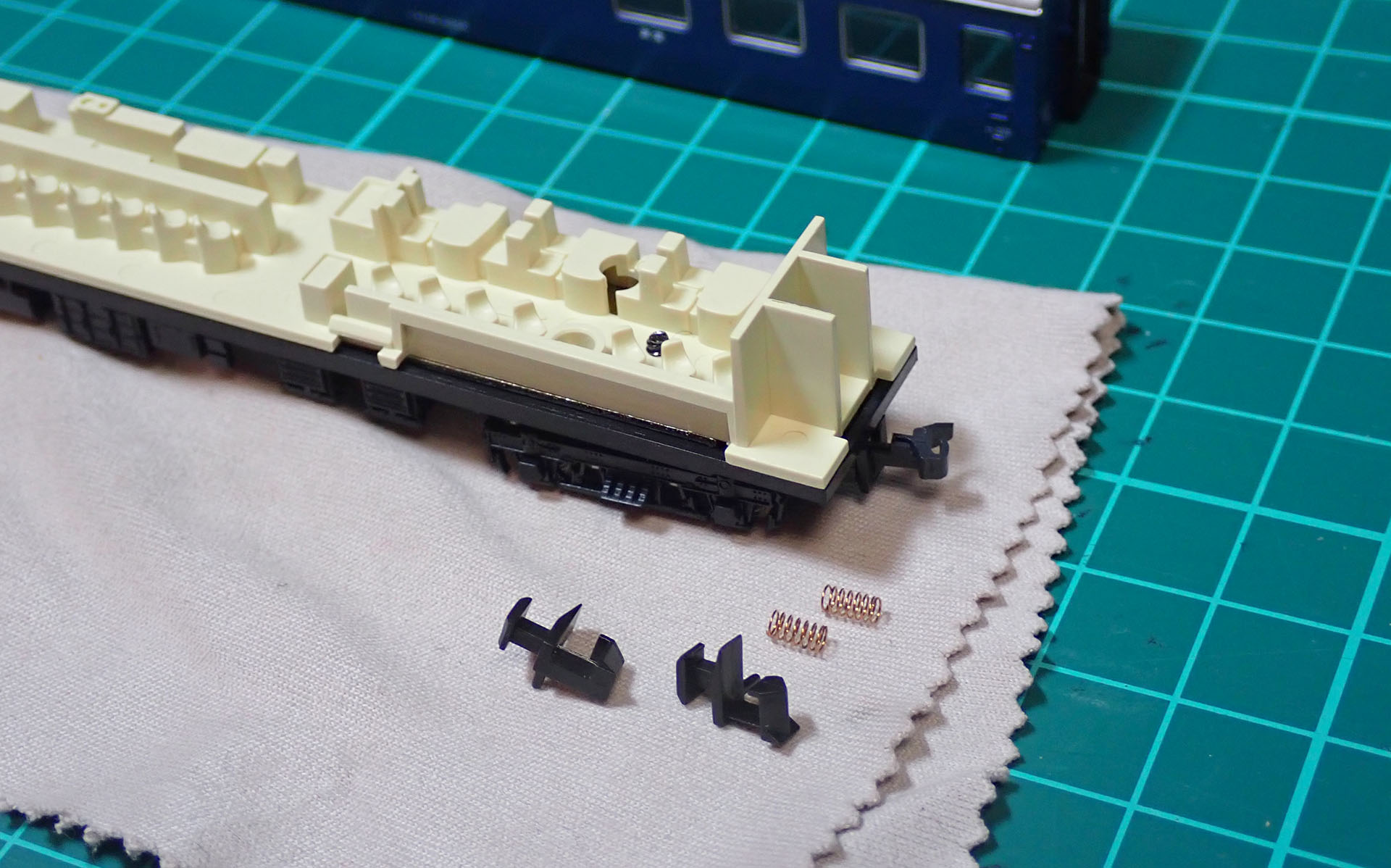 台車を外しなおしてKATOカプラーに交換し、他の車両と連結できるようにします。外したカプラー・ばねは、何かに使うかもしれないので、そのままとっておきます(たまる一方です)。