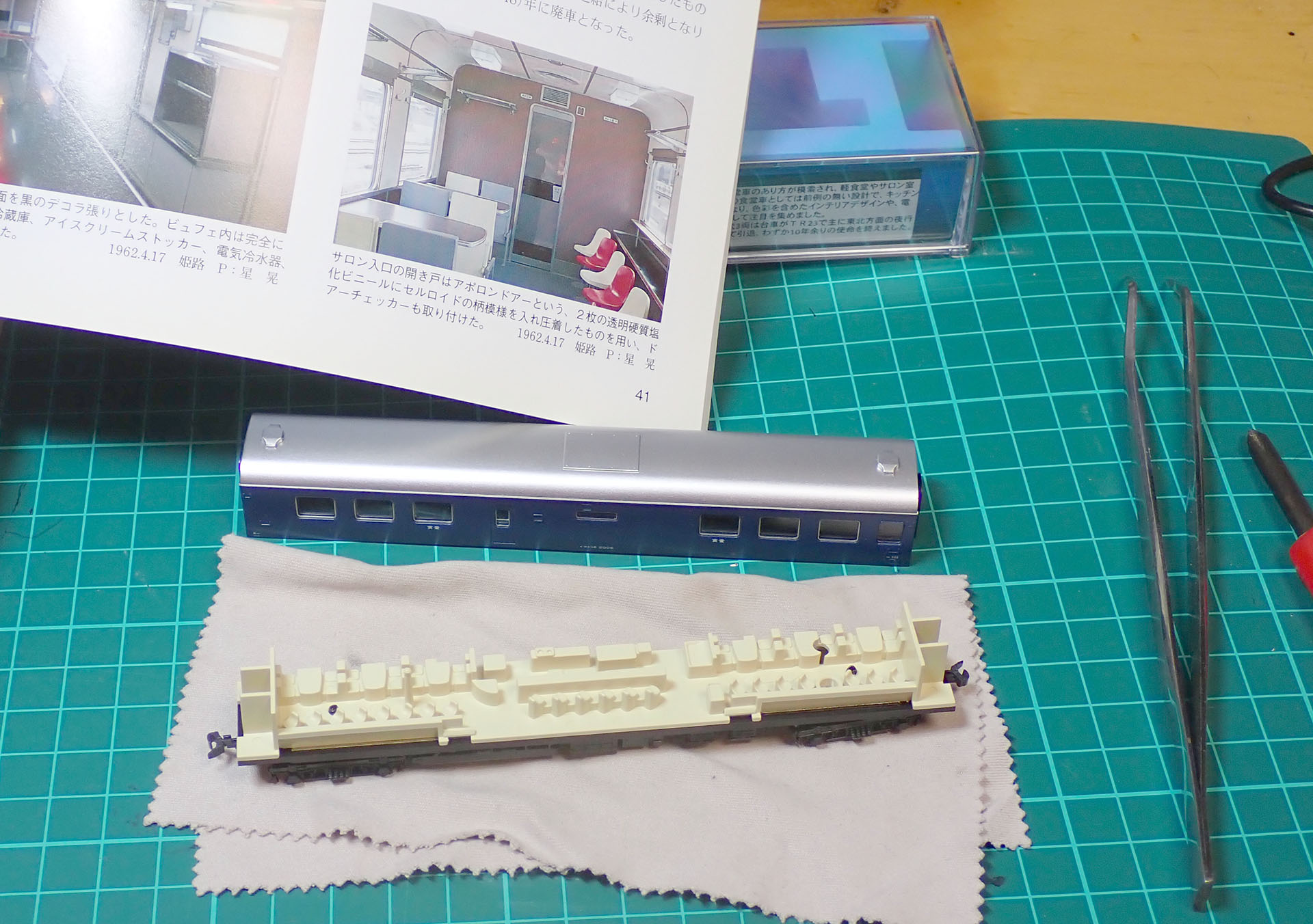 この構造の室内灯は、バネと床下の集電部との接触が命で、微妙な塩梅で室内灯がつかなくなったりします。うまく点灯した状態でそのままボディをかぶせておきました。