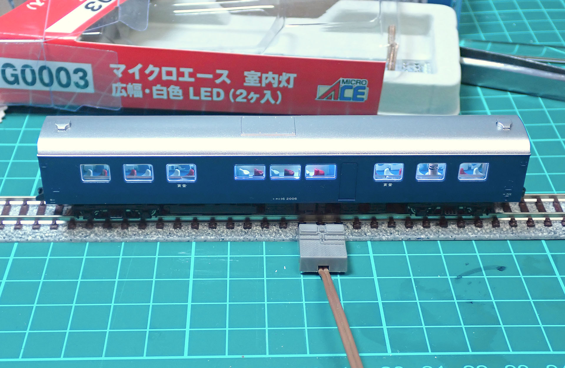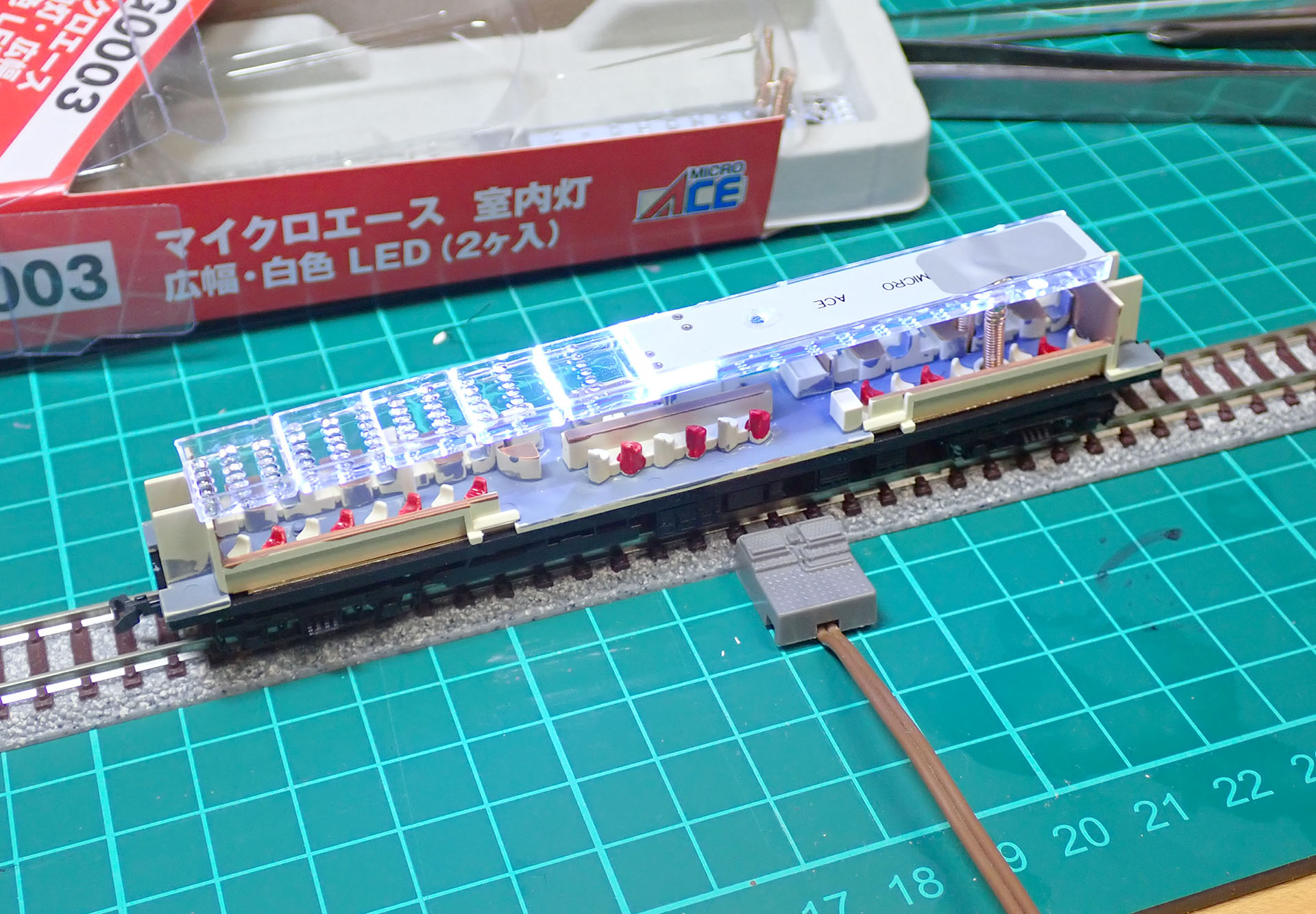 点灯させたところです。構造はTOMIXの室内灯と酷似していると感じます。もちろんきれいに発光し、とても良い感じです。