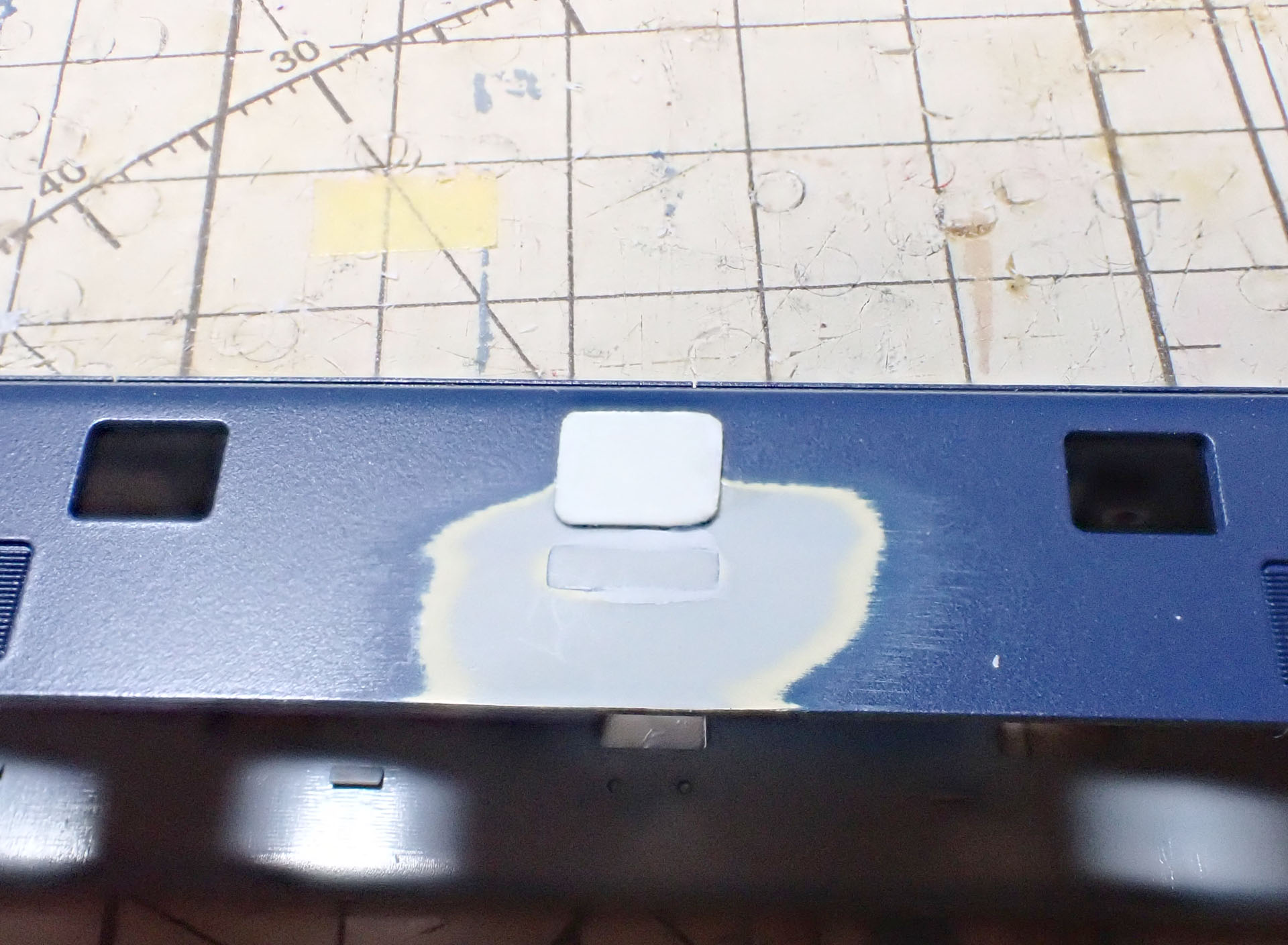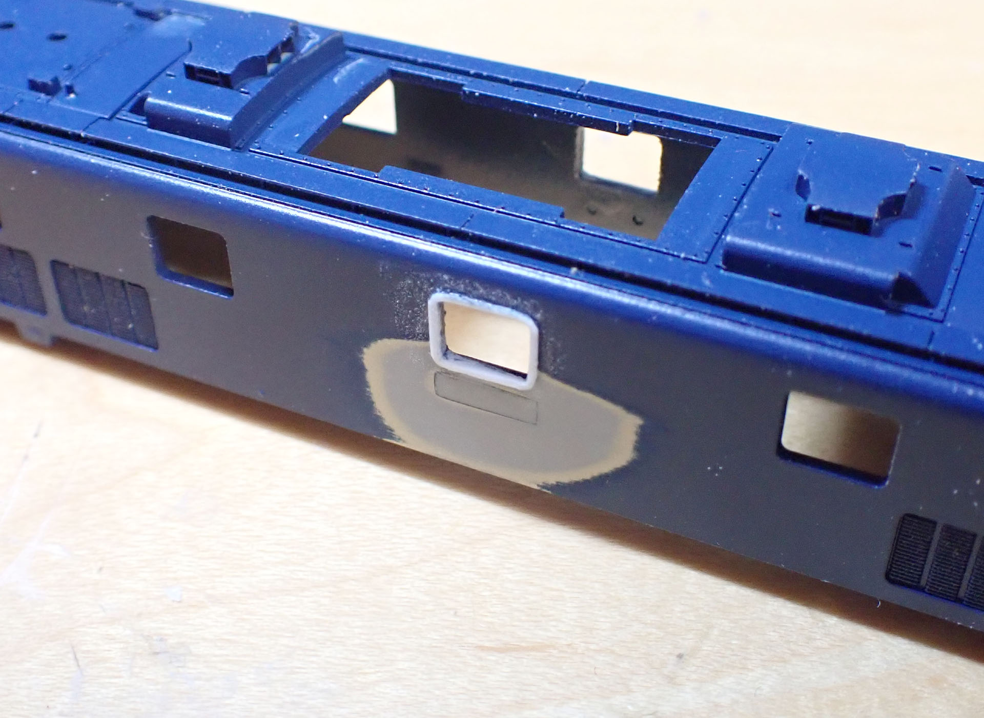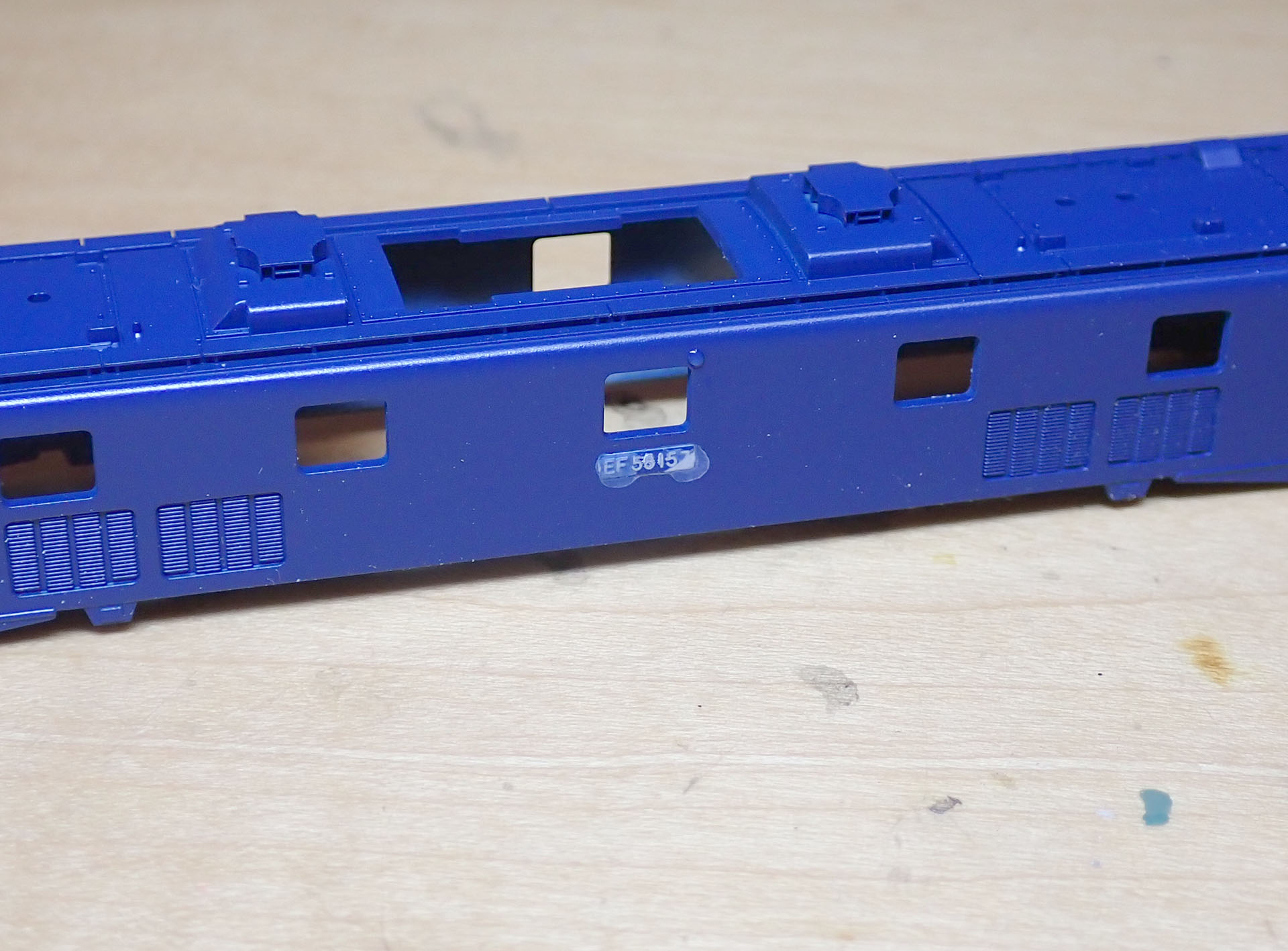 買ったときから157号機のナンバーがついていました。貼り付けのナンバーに変更しますので、隙間を埋め、ヤスリで平らにしておきます。