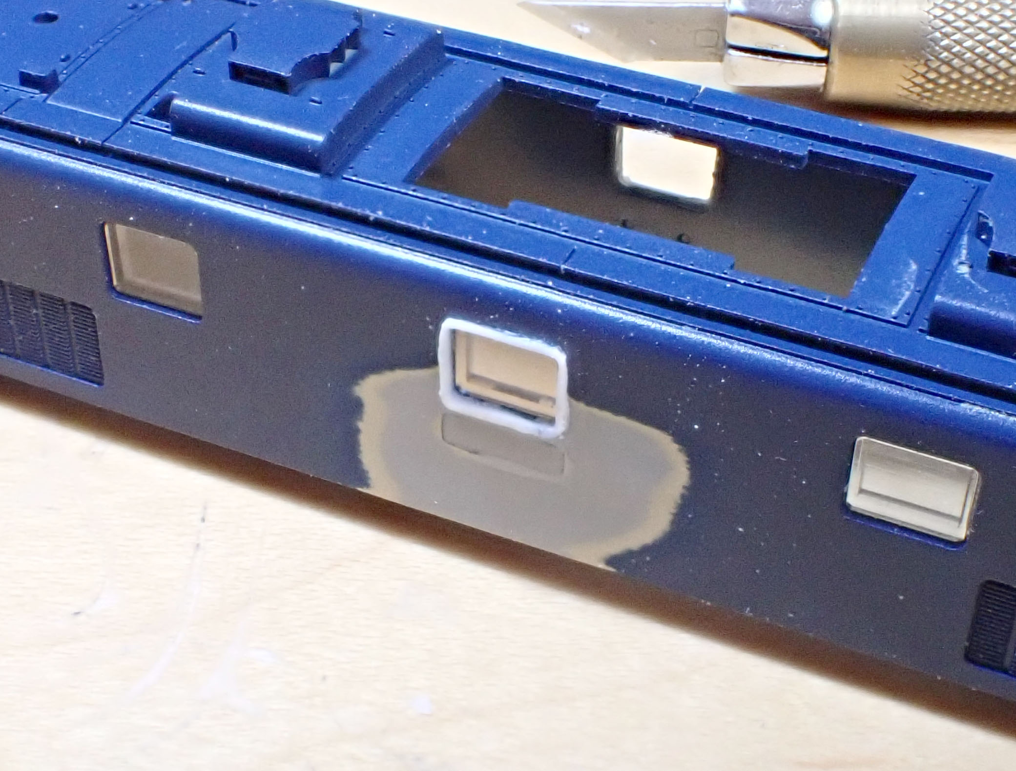 170号機以降の特徴である、機器室の中央の窓がHゴム化されている、という特徴を表現するために、0.1mm厚のプラバンを切っているところです。極論、ここさえ出来ていれば良い、くらいの気持ちで取り組んでいます。